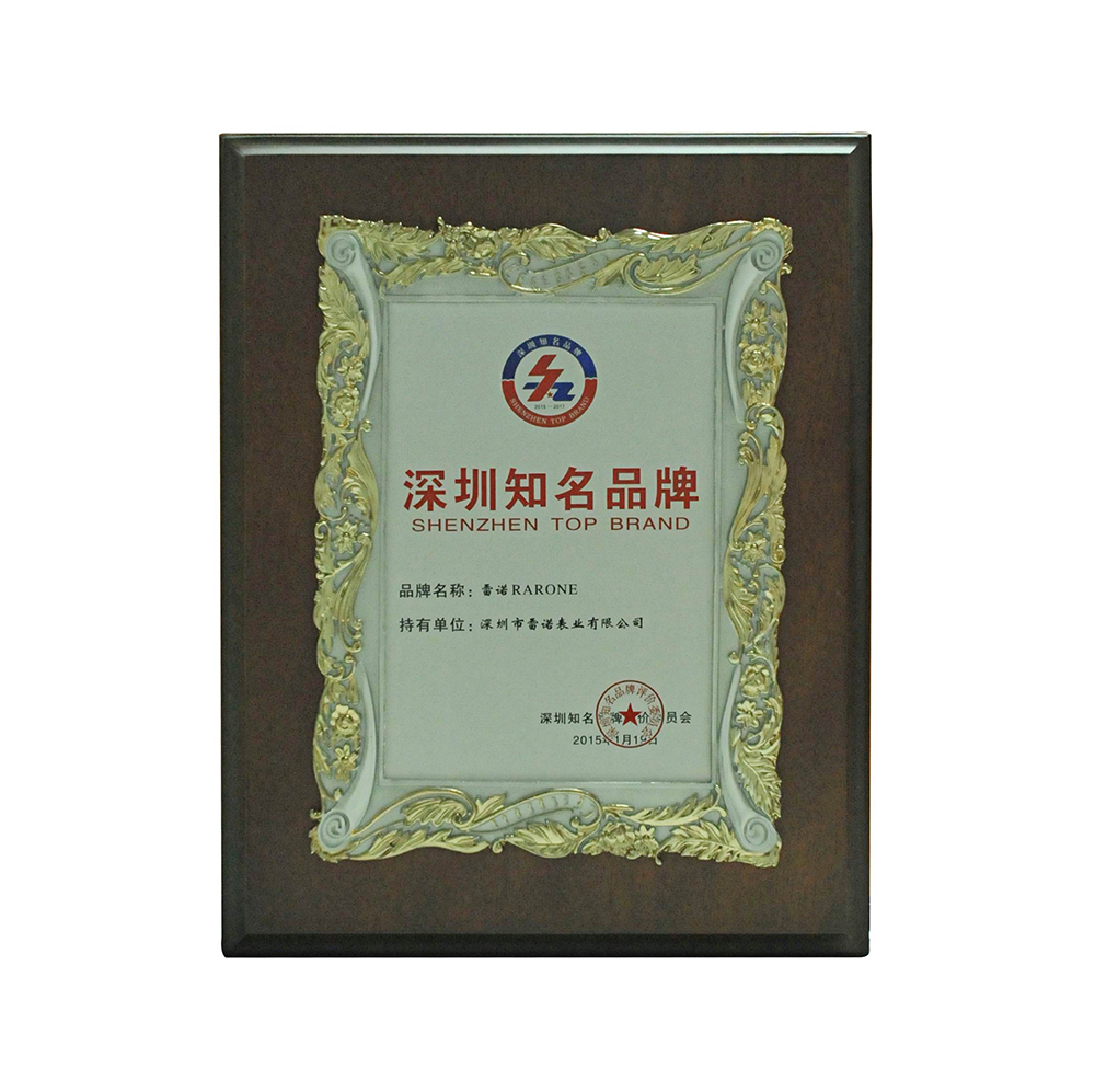 On April 25, 2015, the fifth international high-end forum on brand building and the Twelfth "Well-Known brand of Shenzhen" were held in Shenzhen Wuzhou Hotel. Based on Shenzhen's famous watch brand RARONE , it won the "Shenzhen Well-Known brand" titles of honor. Leaders of the state and relevant state departments, senior officials of international organizations, leaders at all levels in Shenzhen, top promotion agencies of international brands and top brand enterprises at home and abroad are gathered together to share the first-rate brand banquet.